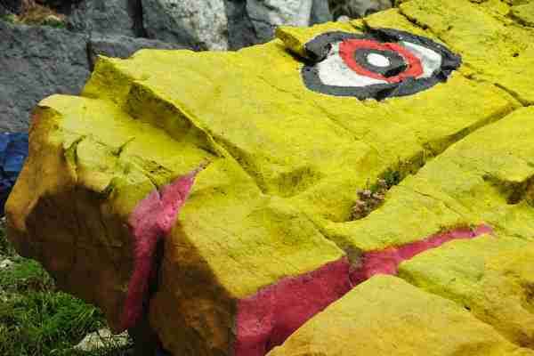 La prima e più nota delle quattro cave che si incontrano lungo il sentiero erboso è la “cava dipinta”. Le diverse forme delle rocce emergenti sono state dipinte dall’artista, assumendo le sembianze di tante facce o di animali stilizzati e dai colori variopinti. Con i colori e gli sguardi immobili sul visitatore, l’artista riflette sul rapporto tra uomo e natura con una scritta sulla roccia: “Il rapporto con il silenzio e lo spazio aperto della natura aiuta a scoprire la propria identità”.