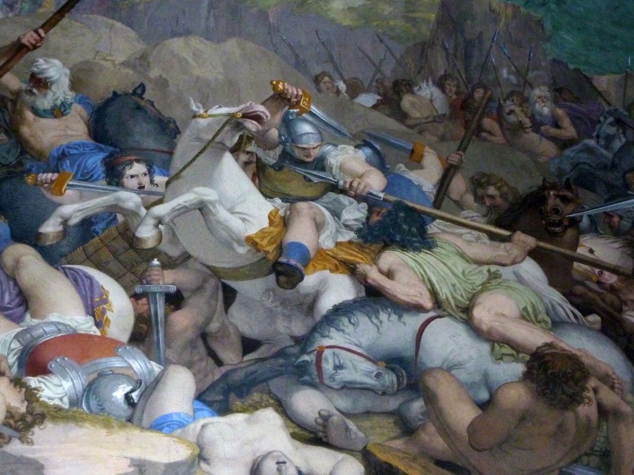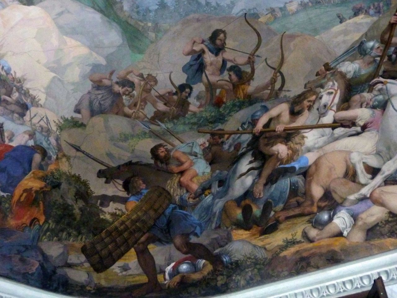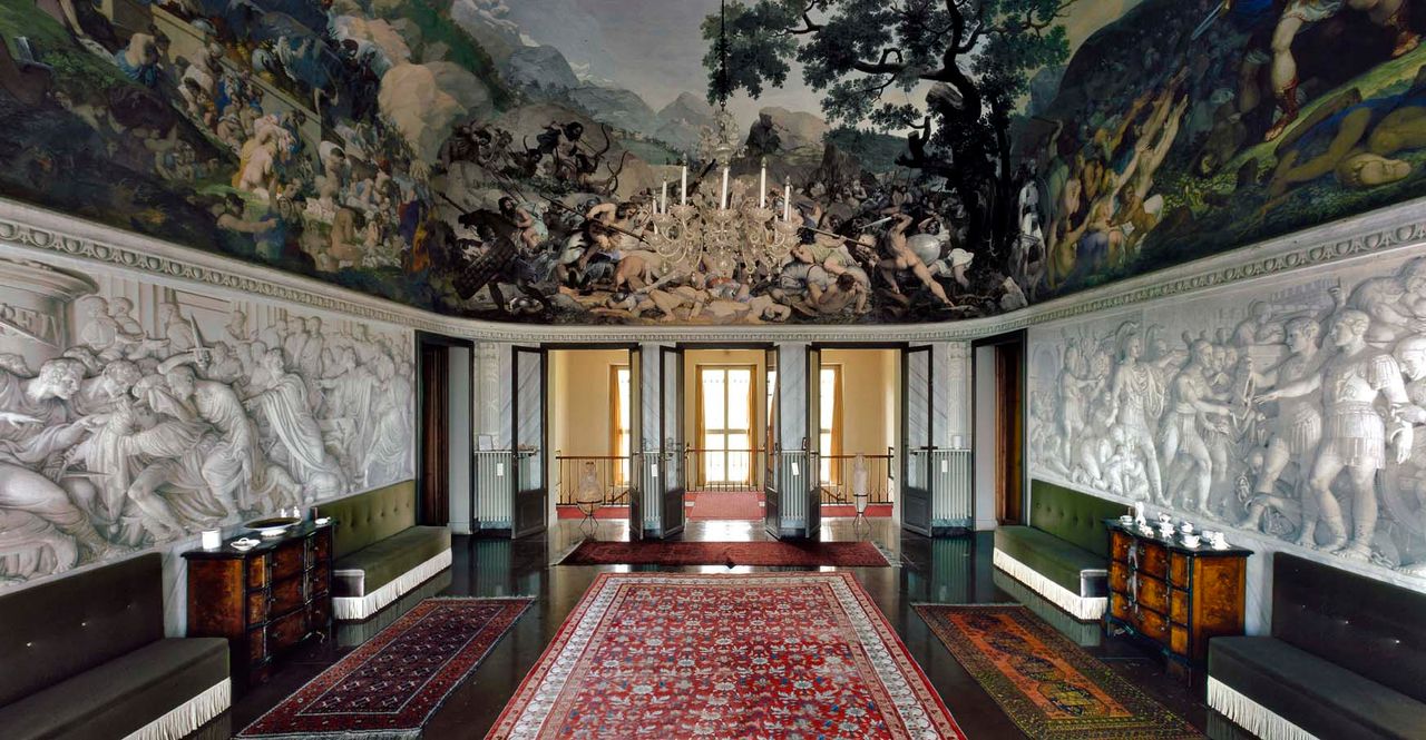 1827, Bartolomeo Gera, importante esponente della vita culturale coneglianese, commissionò la progettazione del suo sogno a G. Jappelli. Adagiata sulla collina del Castello, villa Gera domina la città, offrendo allo sguardo la bella facciata neoclassica a 8 colonne ioniche sormontate da un maestoso timpano, le cui sculture, raffiguranti l’Architettura che ospita le Arti Sorelle, sono opera di M. Casagrande, rinomato scultore dell’epoca e avviato all’arte dallo stesso B. Gera. L’ampio salone al piano nobile fu affrescato nel 1837, sempre per volere dell’infaticabile committente, da G. A. De Min che, contravvenendo a tutti gli accordi presi, decise di rappresentare emblematiche scene tratte dal “De bello gallico” e da altri episodi della vita di Giulio Cesare, che ritraggono la tumultuosa storia degli Elvezi, con evidenti riferimenti alla dominazione asburgica nel Lombardo Veneto.
