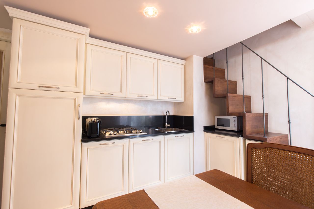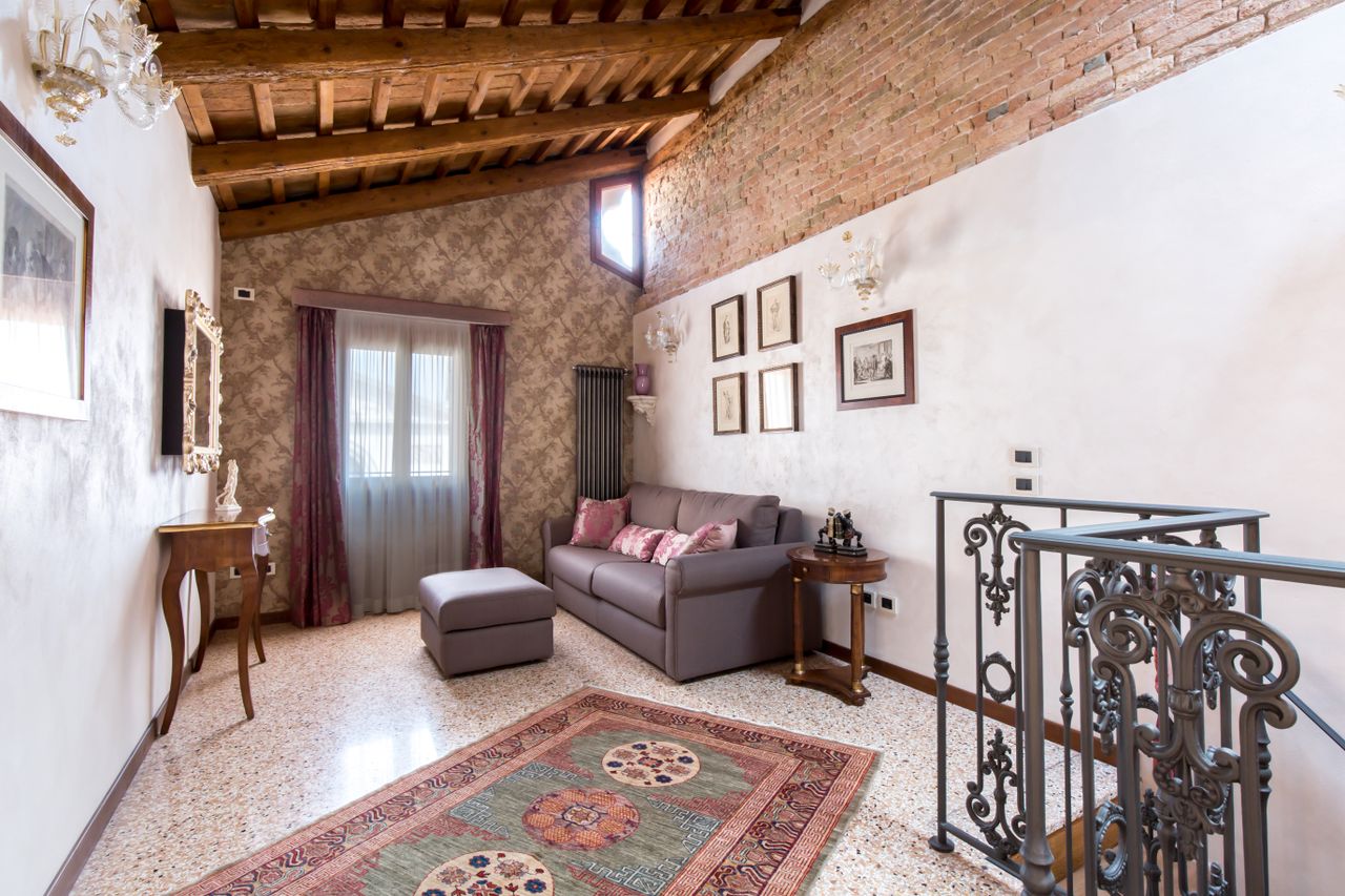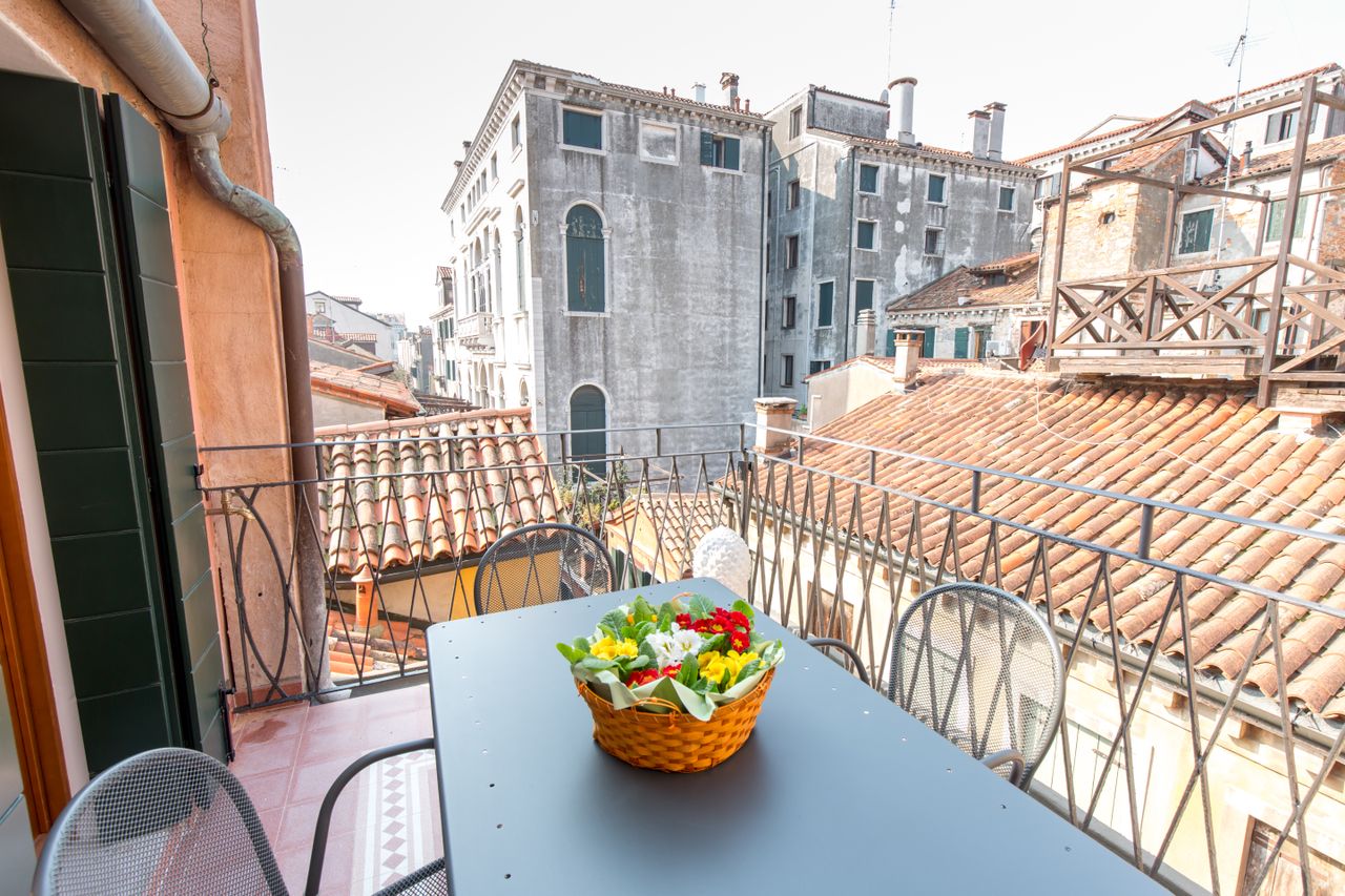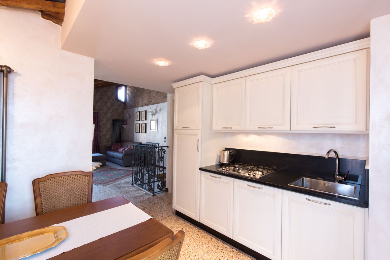 Dalla cucina elegante e raccolta dotata di lavastoviglie, forno a microonde, tostapane e teiera elettrica, si accede sia al soppalco, dove è stata creata una piccola zona riservata per leggere o riposare, sia alla terrazza con vista sui tetti circostanti e con un piccolo scorcio sul Canal Grande, situato a soli 100 metri, per godere di momenti di relax o cene romantiche sotto le stelle.