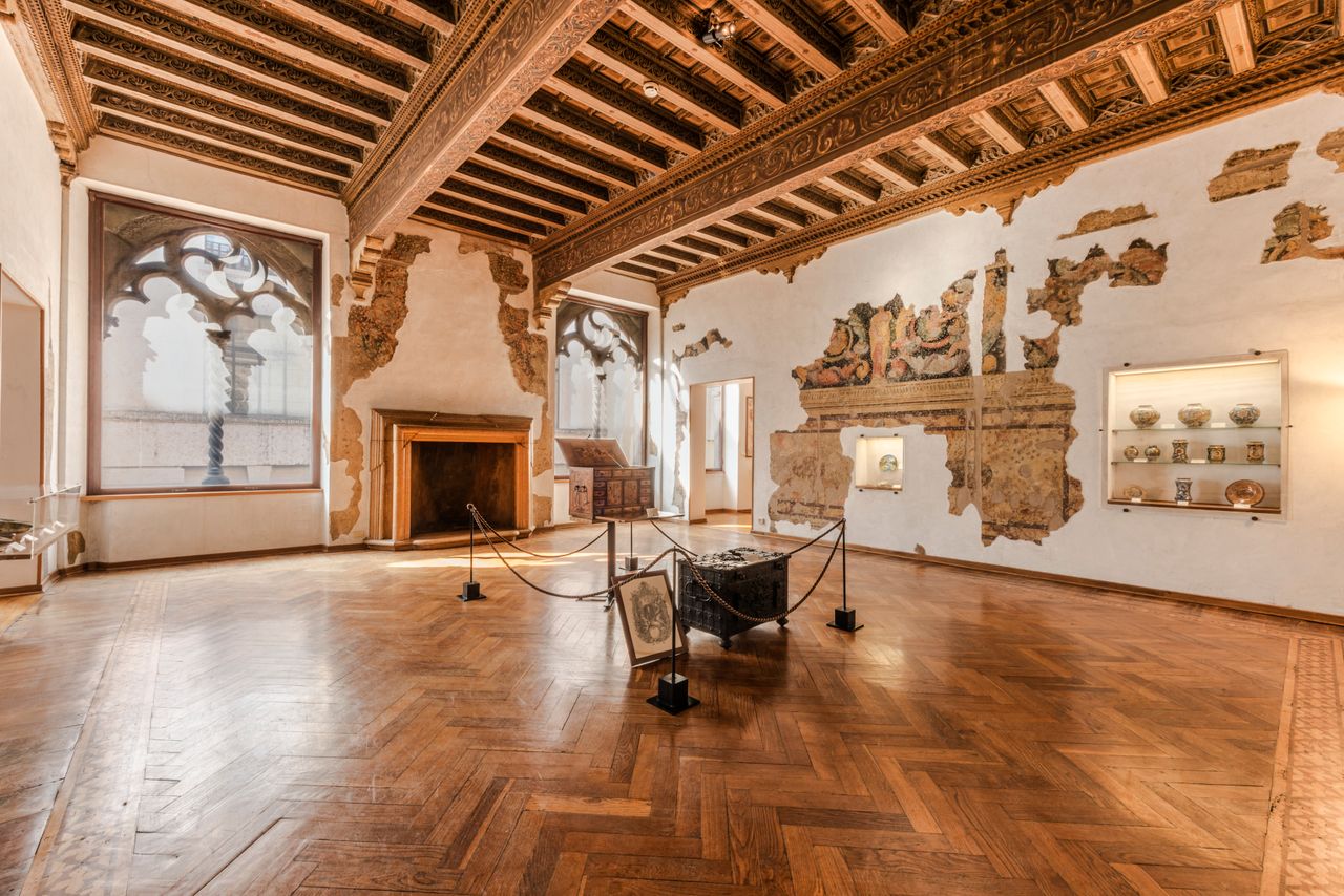 Tra le stanze più significative, la sala delle bifore, la sala da pranzo con tavola imbandita, la biblioteca, la cappella, la sala del camino. L’ampio cortile esterno è realizzato nella parte ottocentesca dell’edificio. (struttura privata)
