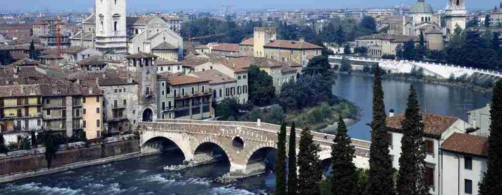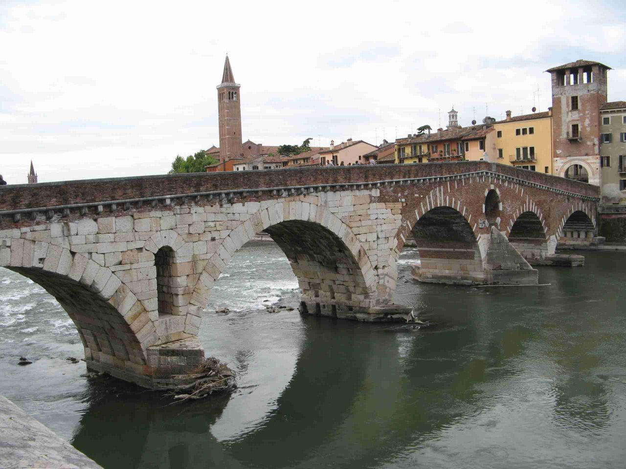Costruito nel I sec. a.C. nel tempo ha subito numerosi crolli, ricostruzioni e restauri sino ad arrivare all’attuale conformazione a 5 arcate. Le due a sinistra, in pietra bianca, sono di epoca romana; quella centrale, in mattoni, è del 1520; l'ultima arcata sulla destra risale ad un rifacimento medioevale del 1298. In tale occasione il ponte fu dotato anche della torre difensiva posta alla sua testa.