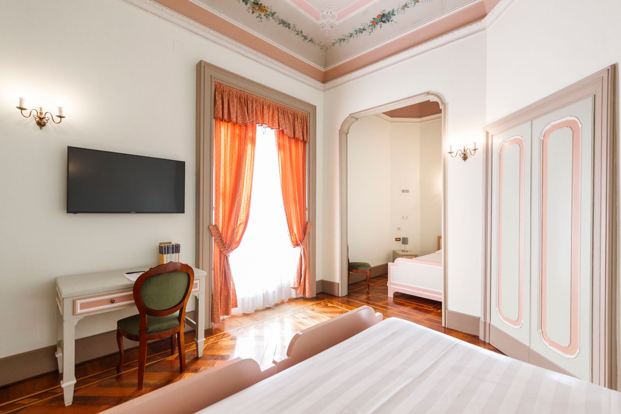 L’elegante struttura architettonica e lo splendido Chiostro del ‘500 vi introdurranno ai suggestivi e ampi spazi interni della dimora, tutti riccamente decorati ed affrescati, in un susseguirsi di sale e salotti di rappresentanza.