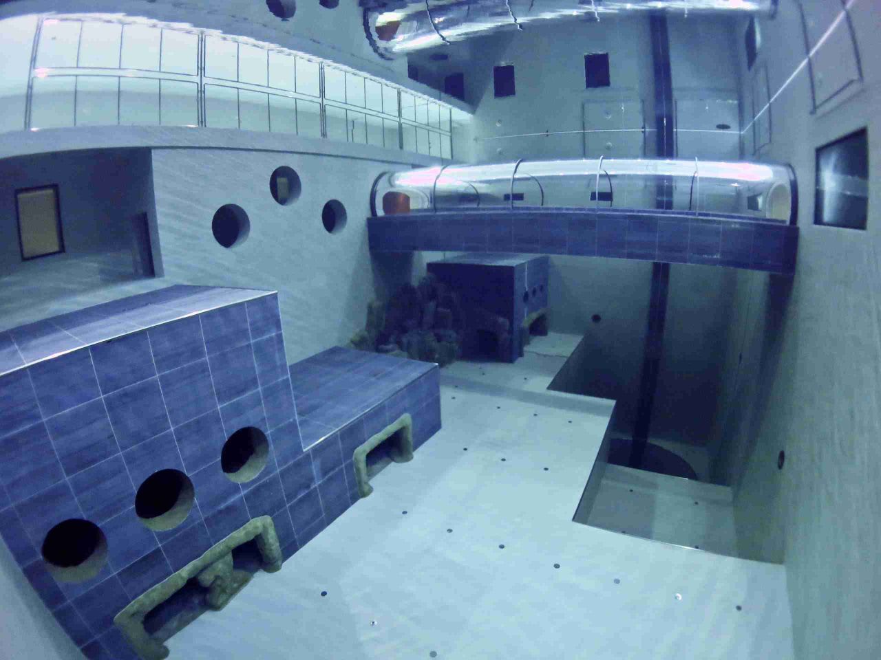 L’architettura sommersa dispone di piattaforme intermedie a diverse profondità da -1.3 metri a -42 metri. L’ampio spazio subacqueo permette di calare in acqua scenografie e fondali di grandi dimensioni potendo effettuare scatti o riprese con profondità di campo che raggiunge i 20 metri.