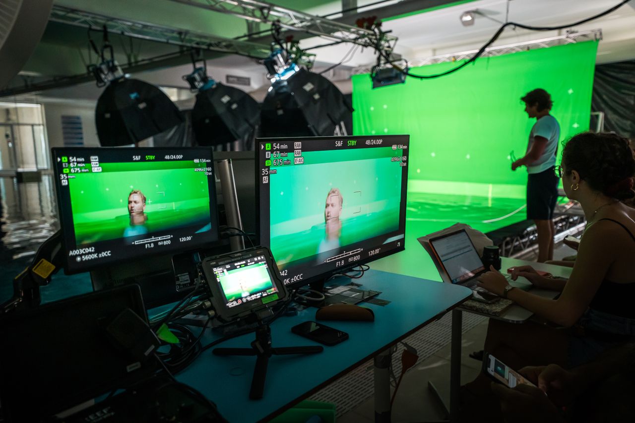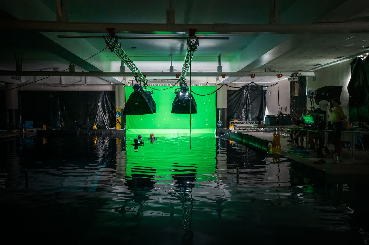 Regia, produzione e clienti possono seguire il lavoro subacqueo direttamente da bordo piscina attraverso monitor e collegamenti audio che permettono una comunicazione bidirezionale tra superficie e operatori subacquei.